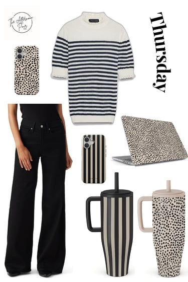 Striped Sweater | Black Wide-Leg Jeans | Animal Print Phone Case | Animal Print Water Bottle | Animal Print Laptop Case | Striped Phone Case | Striped Tumbler