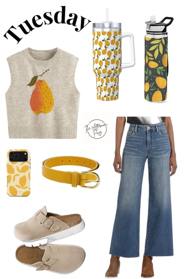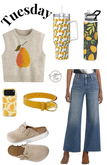 2. Tuesday outfit featuring coordinated accessories: a cozy pear-embroidered sweater vest, wide-leg denim jeans, beige suede clogs, and a mustard yellow belt. Matching accessories include a lemon-patterned phone case, water bottle, and tumbler—perfectly tying together the trending look of coordinating outfits with drinkware and tech accessories.