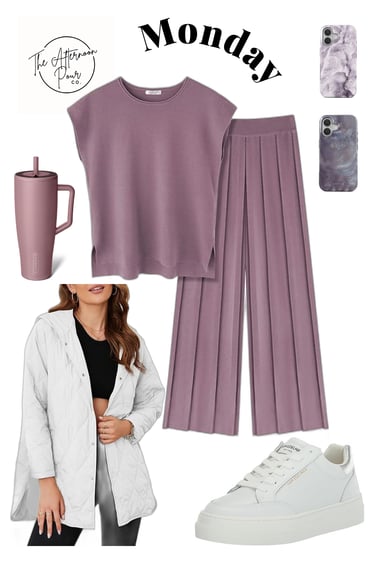1. Perfect dusty purple cozy set for fall with an optional white jacket as needed and crisp white sneakers give off a laid-back vibe. Add a coordinating phone case that matches your dusty purple water bottle! Not only will you look trendy, but you’ll also be comfortable during your busy mornings.