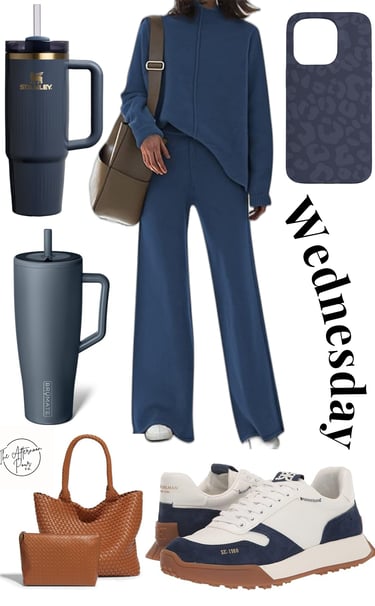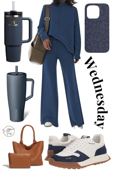 Wednesday outfit featuring sleek monochrome layers: A cozy navy zip pullover paired with wide-leg knit trousers creates the ultimate midweek lounge-meets-streetwear vibe. Coordinated navy accessories include a cheetah-print phone case, options for blue tumblers, and two-tone sneakers that echo the outfit’s color palette. A rich caramel woven tote and matching pouch add texture and warmth—perfectly balancing the cool tones for a cozy-chic, on-the-go look.