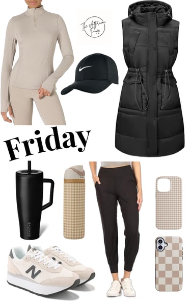 Perfect Women's Joggers | Khaki Quarter Zip | Platform Sneaker | Puffer Vest (cinched waist!) | Gingham Phone Cover | Gingham Water Bottle | Checkerboard Phone Case | Matte Black Water Bottle