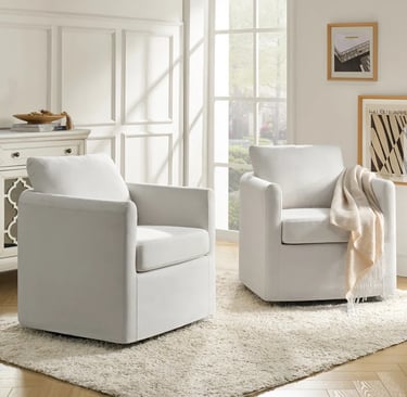 Looking to have an extra seat for a friend? This cute chair comes as a set of two for an afternoon pour with a friend! Square and modern arms give this chair a clean look that can sway into the transitional realm of decor. Double the chair and double the swivel, these chairs are perfect option to host tea time for two!